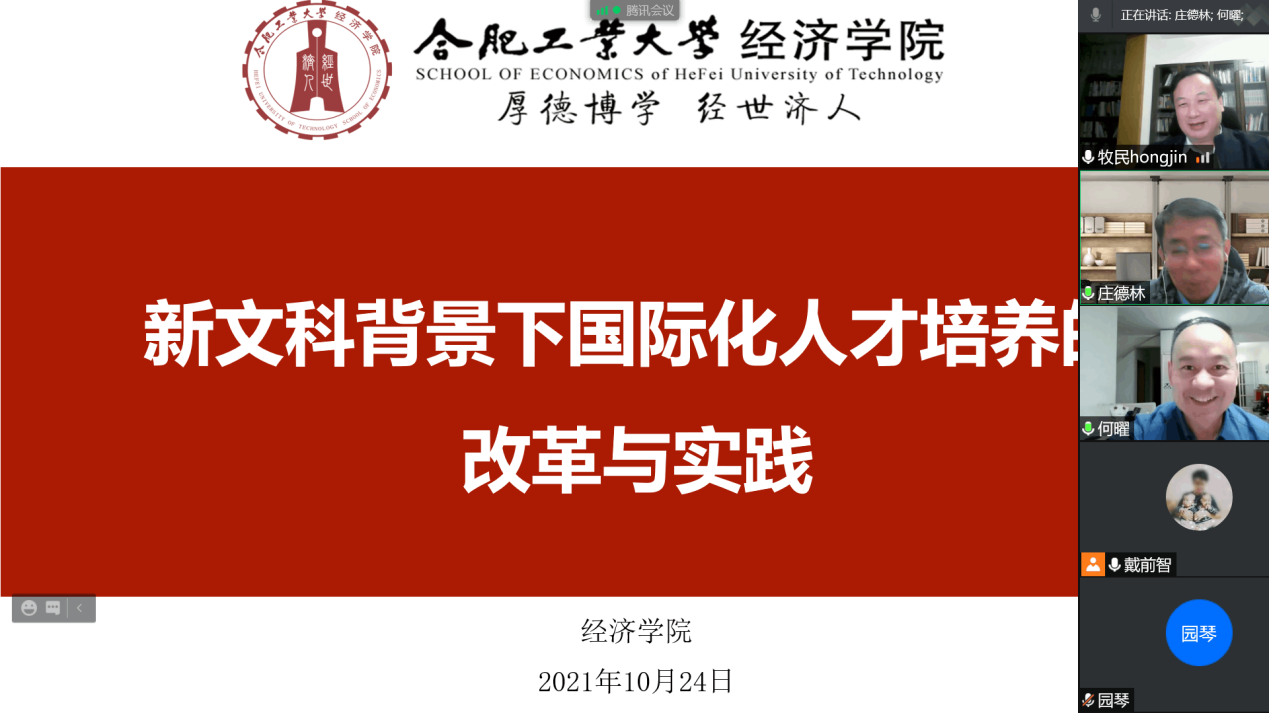 2021年10月24日晚,吉林大学莱姆顿学院副院长何曜应邀为永利官网开展主题为“新文科背景下国际化人才培养的改革与实践”的线上讲座。永利官网副院长庄德林主持会议。院长洪进、国际教育中心全体成员和学院部分教师参与本次讲坛。