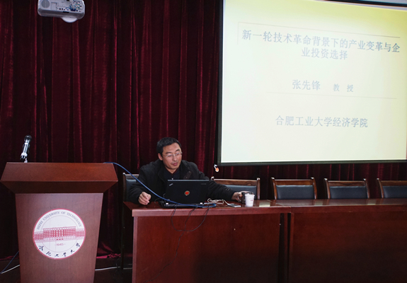2015年12月6日下午2点,“构建区域金融体系,服务经济持续发展”高研班第六场报告在yL23411永利官网登录新区建艺馆703室举行,合工大yL23411永利官网登录张先锋教授为大家做了题为“新一轮技术革命背景下产业变革与企业投融资选择”的精彩演讲。