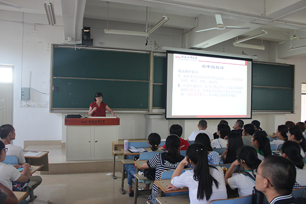8月27日下午3点,2017级辅导员叶荣菁老师主讲《入学安全专题教育》。叶老师首先结合具体案例向新生们说明了安全教育的意义。接着,她向同学们详细介绍了大学生常见的安全问题及预防措施,包括:安全用电、预防火灾;盗窃、诈骗、传销等财产安全;防止溺水;交通安全;饮食安全和网络安全六个方面。其中,叶老师图文并茂地教授了新生火灾逃生和水中自救法。随后,叶老师用现实案例和条文解读警醒新生要遵守国家法律法规和校纪校规。最后,叶老师向同学们特意强调了校园网贷的问题,提醒学生们提高甄别能力,注意养成合理的消费习惯。