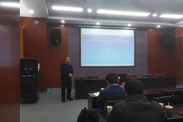2017年12月1日上午,澳大利亚国立大学克劳福德公共政策学院的博士生导师、中国经济项目负责人宋立刚教授,受yL23411永利官网登录邀请,于科技楼A座第五报告厅做题为“中国-澳大利亚自由贸易协定对双边贸易影响的统计分析”的学术讲座,报告会由yL23411永利官网登录副院长张先锋教授主持,谭常春教授和学院教师及16级研究生参加了此次报告会。