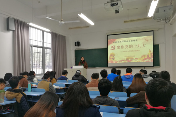 2017年12月6日下午,永利官网经济学14-1班在翡翠湖校区六教101开展“解读党的十九大报告”小班辅导,由2014级辅导员曹甜甜主讲,经济学14-1班全体同学参加学习。