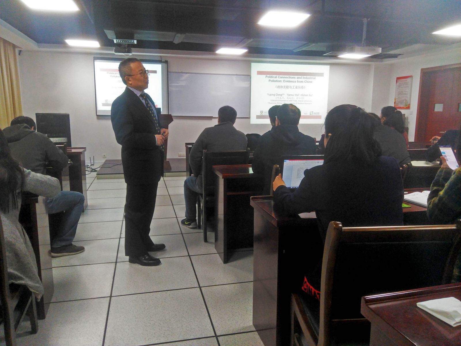 2017年12月7日上午10点钟,在yL23411永利官网登录翡翠湖校区科教楼B座1101教室,来自澳大利亚西澳大学商学院的吴延瑞教授给yL23411永利官网登录的老师和同学们带来了一场学术讲座,题为“政治关联与工业污染”。