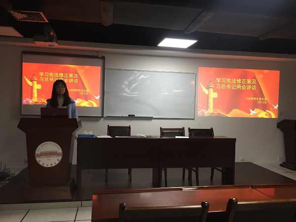 会议开始,支部书记赵如月同志向全体研究生介绍此次全国两会的召开情况。3月3日全国政协十三届一次会议开幕会的召开,正式拉开了2018年全国两会的大幕。紧接着,十三届全国人大一次会议开幕会于3月5日召开。在此次两会上,政协会议需要听取和审议政协全国委员会常务委员会工作报告、上次会议以来提案工作情况的报告,同时列席人大会议,听取讨论政府工作报告及其他有关报告等,而人大会议则需要听取和审议政府工作报告、审查国务院关于国民经济和社会发展计划的报告、审查国务院关于中央和地方预算执行情况的报告、听取和审议全国人大常委会、最高人民法院和最高人民检察院的工作报告。除此之外,在3月11日下午的十三届全国人大一次会议第三次全体会议上经投票表决,通过了《中华人民共和国宪法修正案》。这也是继2004年3月14日第十届全国人大第二次会议通过宪法修正案后,我国宪法迎来的又一次修改!