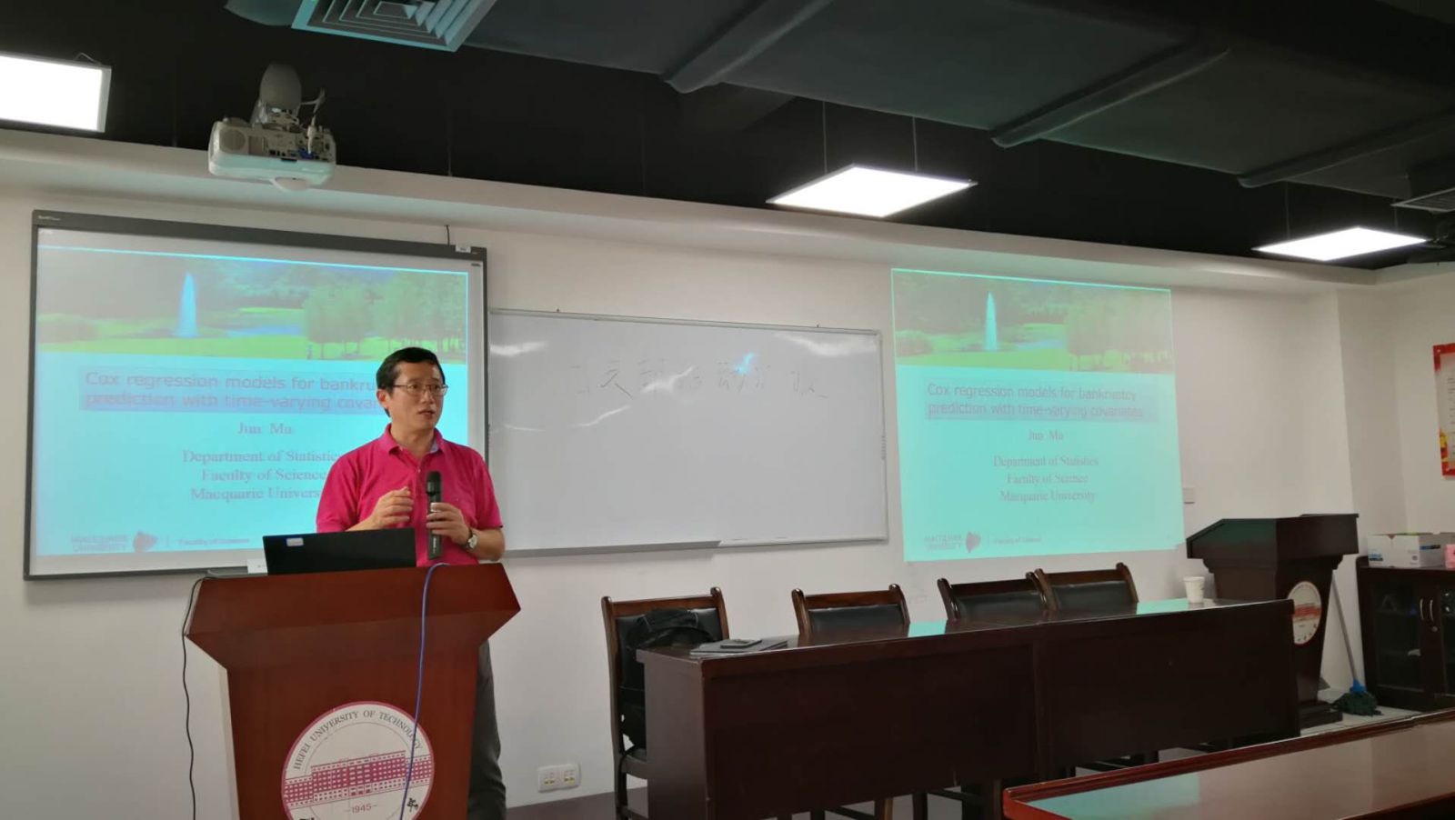 2018年5月17日下午四点,在yL23411永利官网登录翡翠湖校区科教楼B座1101会议室,开展了一场由澳大利亚麦考瑞大学统计学院马骏副院长带来的关于“具有时变协变量的破产预测的Cox回归模型”的学术交流会。yL23411永利官网登录金融研究所所长朱卫东、数量经济研究所所长谭常春、MF中心主任张根文以及永利官网部分本科生、研究生参加了本次交流会。