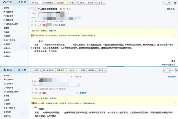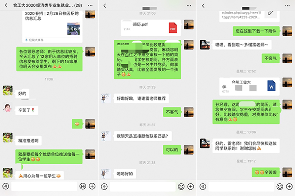 网络双选会召开前,毕业班辅导员老师雷磊通过开展班级就业工作推进会、毕业生就业工作动员会以及就业信息数据摸底统计等工作,充分调研毕业生就业意愿,并积极邀请重点企业参会。网络双选会开展过程中,辅导员老师动员同学们及时关注企业招聘信息,积极投递简历,并亲自帮助部分同学修改简历信息。同时,辅导员老师还根据毕业生就业意向将简历定向推送至企业HR手中,确保学生就业意愿与企业岗位需求实现精准匹配。