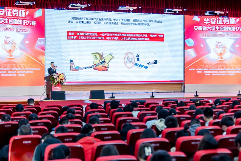 3月24日下午,“华安证券杯”安徽省大学生金融知识大赛暨金融知识进百校启动仪式在翡翠湖校区科教楼A座报告厅举行。共青团安徽省委副书记李波,中证中小投资者服务中心副总经理黄勇,华安证券党委书记、董事长章宏韬,安徽证监局投保处处长杨柳,安徽省金融青联副主席、秘书长陈毓、校团委书记武国剑、yL23411永利官网登录院长洪进、党委副书记、纪委书记谢晶晶出席启动仪式。