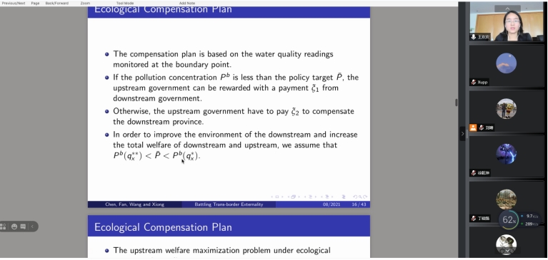 在第一场活动中,王欢欢教授首先汇报了工作论文“Battling Trans-border Externality: Evidence from Cross-jurisdictional Ecological Compensation in China”,报告由张先锋副院长主持。王老师以新安江的跨省污染治理为例,从理论与经验两个方面细致探讨了跨界外部性的应对之策。针对永利官网师生对论文中模型构建与机制识别等提出的问题,王欢欢教授进行了耐心的解答。在第二场交流活动中,王欢欢教授就交叉学科的研究心得、Journal of Economic Surveys 期刊介绍、新文科与一流课程建设和全英文授课经验等三个方面进行了分享与交流。